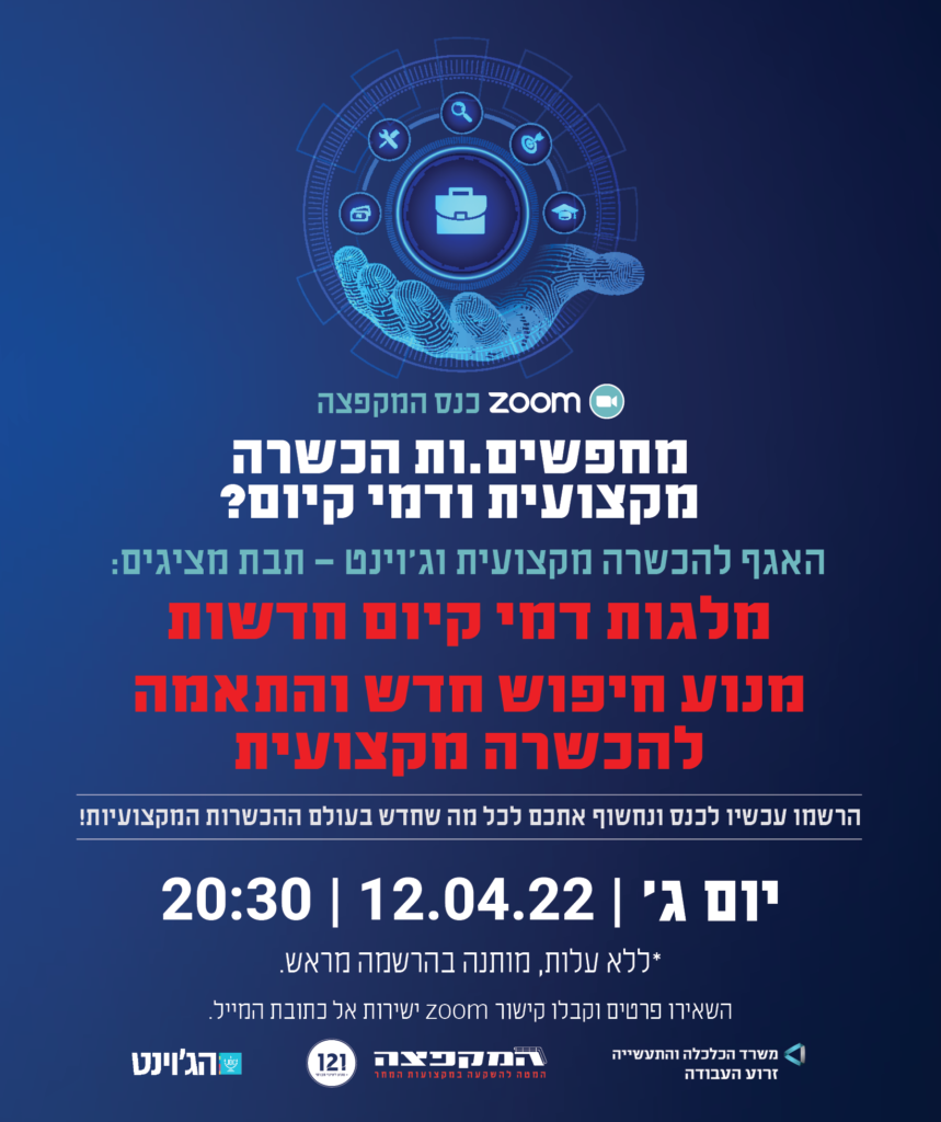 שמחים להזמין אתכם לכנס ZOOM שאנו מארגנים ובו תוכלו לקבל את כל המידע החדש. כנס "המקפצה", בשיתוף עם האגף להכשרה מקצועית במשרד הכלכלה וג'וינט-תבת, יתקיים ביום שלישי הבא, 12/4/2022, בשעה 20:30.
