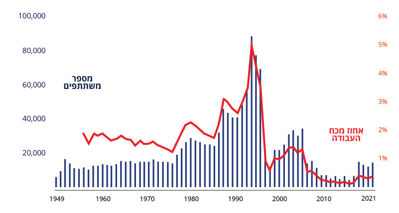 ניתוח הגרף: ברוב השנים הוכשרו 2-3 אחוזים מכח העבודה במדינה. עם גל העלייה מברה״מ לשעבר, מספר המשתתפים הלך וגדל עד לשיא של קרוב ל-90,000 משתתפים ב-1991. עם סיום גל העלייה, היקף ההכשרות ירד דרמטית ואז חלה התאוששות מסוימת. ב-2003 ניחתה מכה קשה על ההכשרות: מ-34,000 משתתפים בהכשרות ב-2002 ל-14,000 משתתפים ב-2002 ואח״כ עוד ירידה לשפל של אלפים בודדים של משתתפים, עם התאוששות מסויימת בשנים האחרונות. כיום עדיין מוכשרים רק כ-0.3% מכח העבודה.