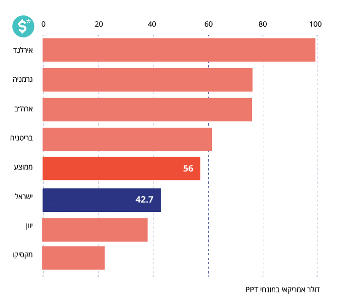 אחת התוצאות של חוסר ההשקעה במיומנויות עובדים בישראל, היא שהתפוקה הממוצעת שלהם היא נמוכה יחסית. לכך תורמת במידה רבה גם ההשקעה הנמוכה בתשתיות הפיסיות במקומות העבודה. כפי שניתן לראות בגרף שפורסם בדו״ח בנק ישראל ל-2017, התוצר הממוצע של העובדים בישראל מגיע ל-42.7 דולר לשעה, לעומת 56 דולר לשעה ממוצע ב-OECD. בארה״ב התוצר הממוצע של העובדים עומד על יותר מ-70 דולר לשעה. הבעיה העיקרית היא שמצב זה קבוע כבר עשרות שנים, ללא תזוזה לכיוון של הדבקת הפער.