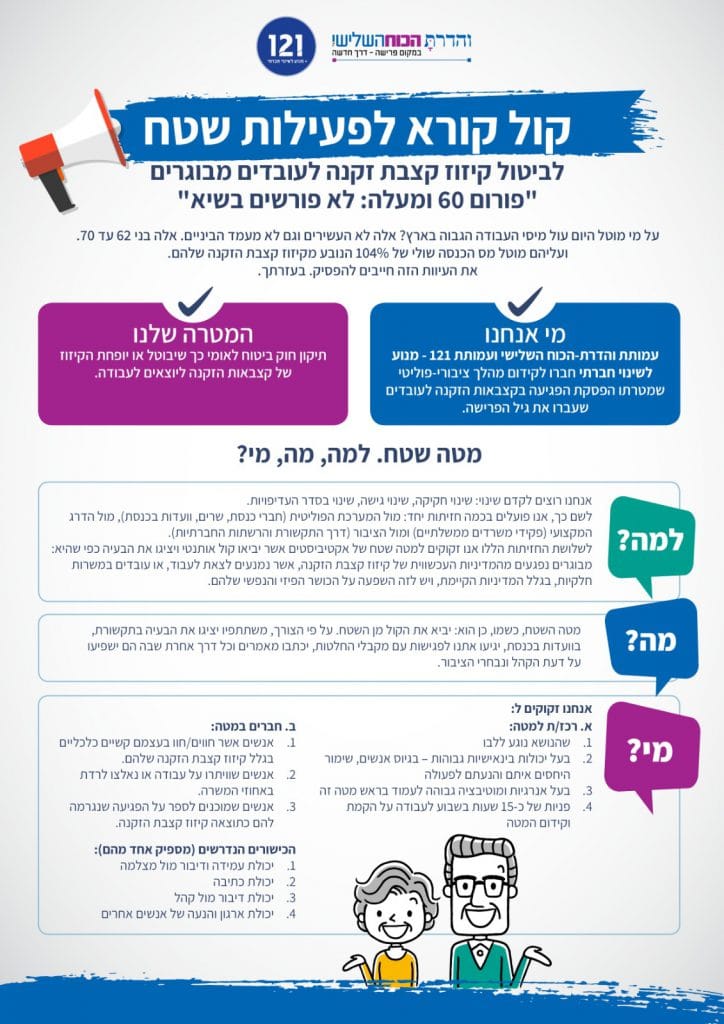 במסגרת זו, אנו מזמינים אתכם להצטרף למטה השטח שאנו מקימים בימים אלו יחד עם עמותת ״והדרת – הכוח השלישי״, שנועד להביא קולות ופעילות שטח כדי להסביר לקובעי המדיניות את הצורך בהפסקת הפגיעה בקצבאות הזקנה לעובדים שעברו את גיל הפרישה.