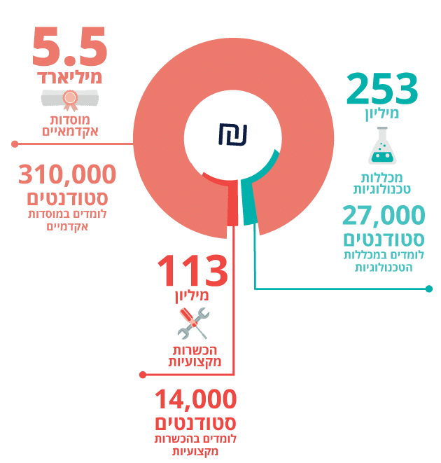 עד כמה נמוכה היום ההשקעה בלימוד מיומנויות לעבודה? השורה התחתונה היא המדינה משקיעה רק 2% מהסבסוד של לימודים באקדמיה בלימודים של בני 18 ומעלה מחוץ לאקדמיה ולמכללות הטכנולוגיות. ראו בתרשים את הפירוט.