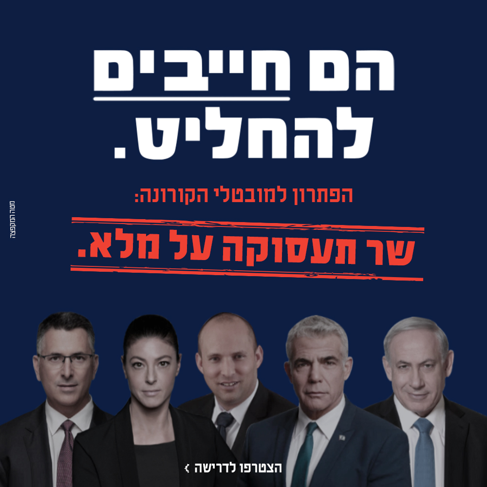 בלחיצת כפתור מהירה, שלחו מייל ישירות למובילי המו״מ הקואליציוני וסייעו לנו ללחוץ עליהם למנות שר תעסוקה על מלא - שיעבוד עבור המובטלים 24/7!