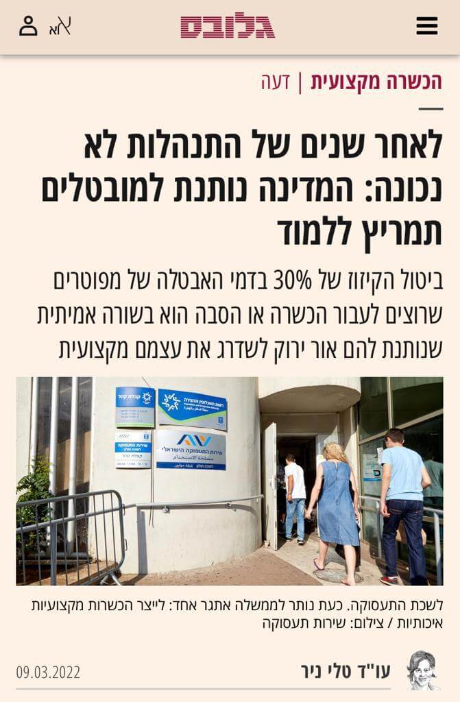 חזרנו וטענו כי קיצוץ דמי האבטלה מהווה תמריץ שלילי למובטלים לשדרג את כישוריהם המקצועיים ולהשתלב בשוק העבודה החדש. ואכן, בעקבות מאבק ציבורי ותקשורתי שהובלנו ועבודה אינטנסיבית מול מקבלי ההחלטות, בתחילת מרס 2022 העיוות בחוק בוטל לצמיתות ומובטלים שישתפו בהכשרות יקבלו דמי אבטלה מלאים.