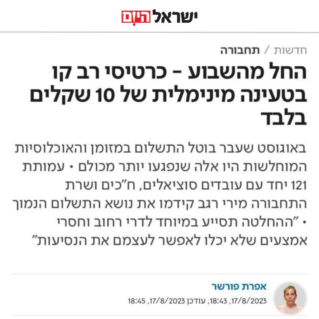 בעקבות פעילותנו, כרטיסי רב קו ניתנים לטעינה מינימלית של 10 שקלים בלבד מאז אוגוסט 2023. כך, כל ציבור הנוסעים יוכלו לבצע נסיעה חד פעמית בדומה לנסיעה שהתאפשרה להם כאשר ניתן היה לשלם במזומן.