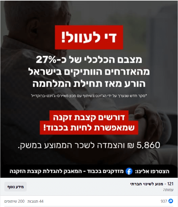 מאז שהחלה המלחמה, מצבם של מאות אלפי אזרחים ותיקים התדרדר משמעותית בעקבות עלייה תלולה ביוקר המחיה ושחיקתן של קצבאות הקיום. מדי יום נדרשים אזרחים ותיקים לבחור בין מזון, דיור ותרופות.