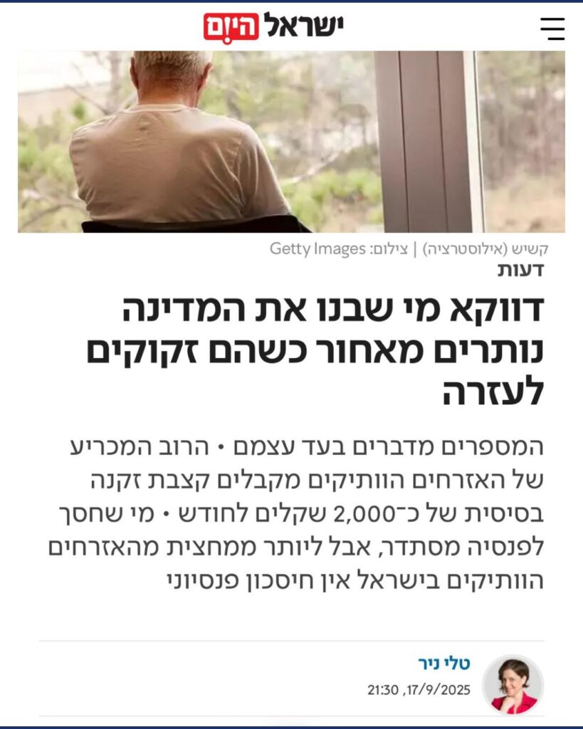 - דווקא מי שבנו את המדינה נותרים מאחור כשהם זקוקים לעזרה | ישראל היום, 17.9.25