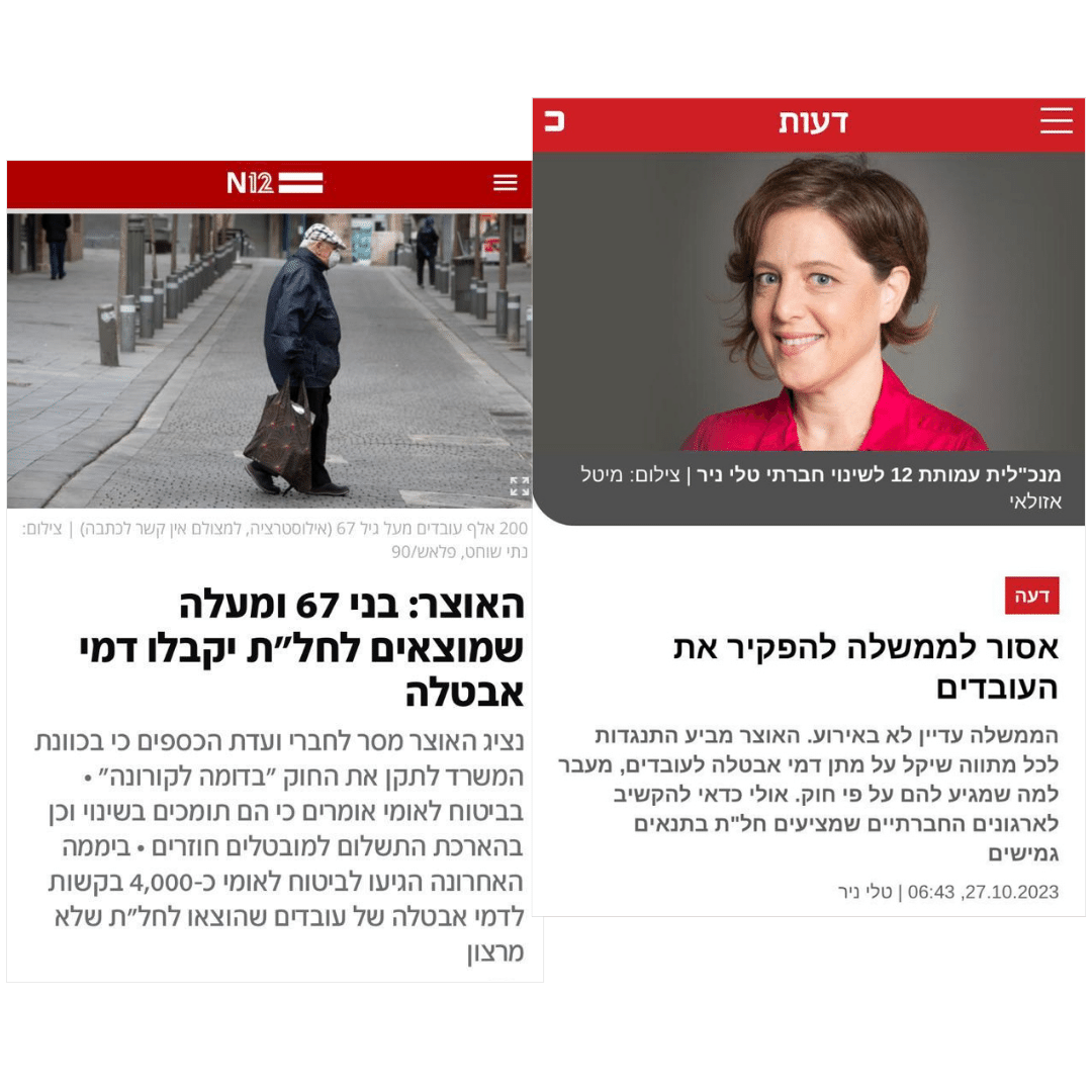 2. בני 67 ומעלה יקבלו דמי אבטלה של 75% או עד גובה של 4,000 ש"ח.
